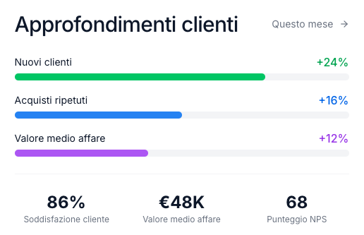 Con Claint, ogni dato è aggiornato in tempo reale e visualizzato in una dashboard intuitiva che ti offre una visione completa e immediata delle tue performance commerciali.